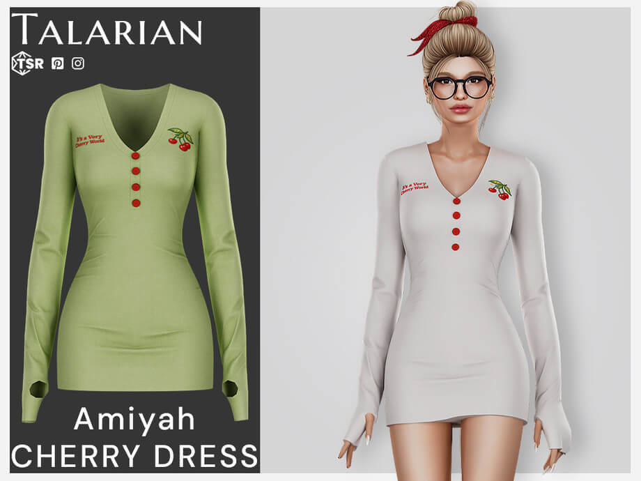 Amiyah Cherry DressLong sleeve bodycon dress with deep V-neckline, cherry embroidery, front button detail and sleeve cutouts