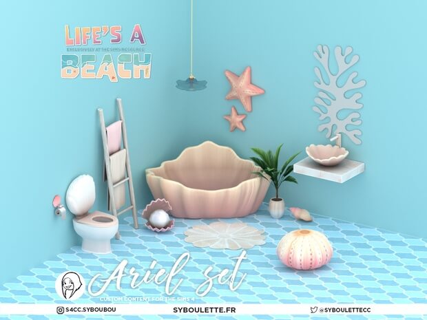 Ariel set (Life’s a beach TSR collab) Introducing the Ariel bathroom set, a vibrant collection created for the Life a Beach collab on TSR! Dive into a world of color and ocean-inspired decor, perfect for mermaids and all Sims who adore the sea. This bathroom collection features shell forms and coral shapes, offering a beautiful and fun nautical theme that will make your Sims feel like they’re right by the beach. Transform your bathroom into an aquatic oasis and let your Sims’ love for the sea shine through!
