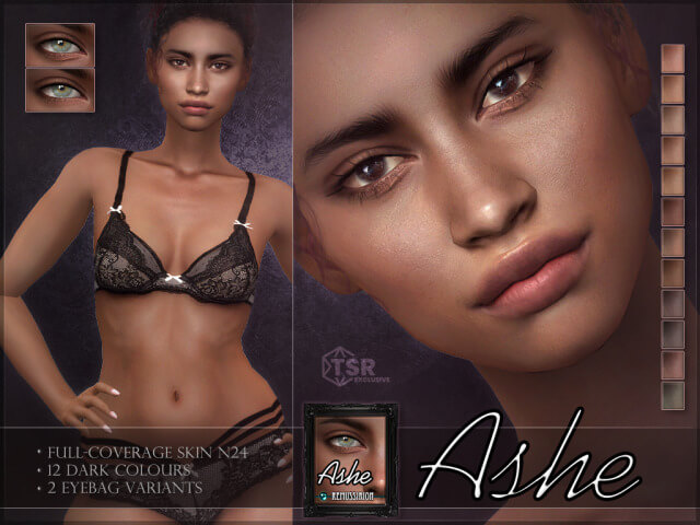 Ashe – Female Skin 24 – Dark colours Get Ashe, Female skin 24 in natural medium and dark shades. The skin comes with its own colours. Previews were taken with HQ mod. – 12 colours – 2 eyebag variants (V1: with eyebags. V2: without) – HQ compatible – skin detail category – female only – teen – adult – custom thumbnail