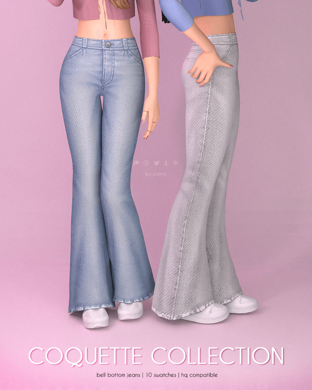 Bell Bottom Jeans – Coquette Collection Hi! These are a bell bottom jeans for the Coquette Collection 😊 I hope you like them! You have 10 swatches (different shades of blue, white, grey, black…). They are HQ compatible and can be found in the jeans section of the CAS.