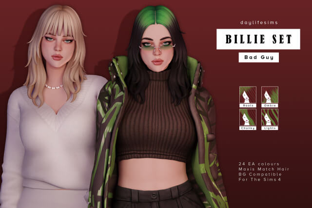 New meshes Base game compatible 24 EA colours Hat compatible All LODs Custom Thumbnail V1 (with bangs) – V2 (without bangs)