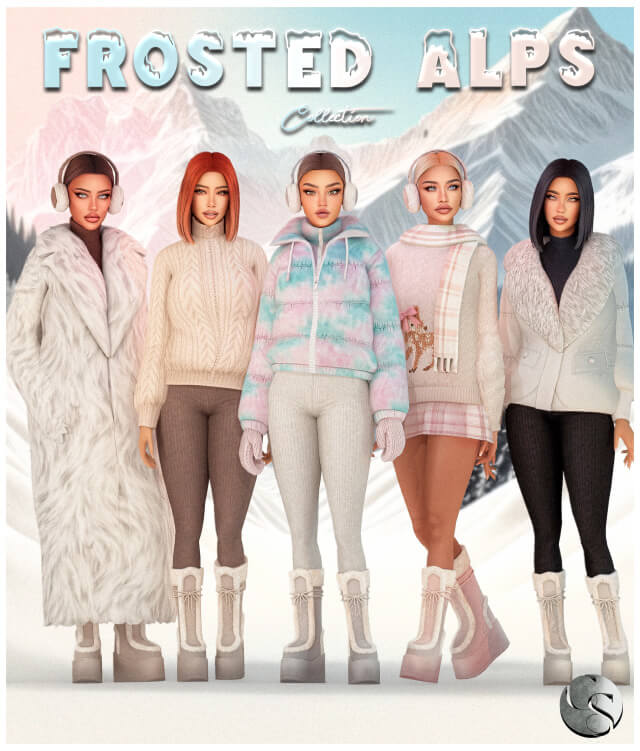 CAMUFLAJE – Frosted Alps Collection This winter collection includes 12 items (2 jackets, fur coat, sweater, leggings, boots, earmuffs, scarf, mittens, north hair/2 versions – regular maxis & ombre and polar hair)