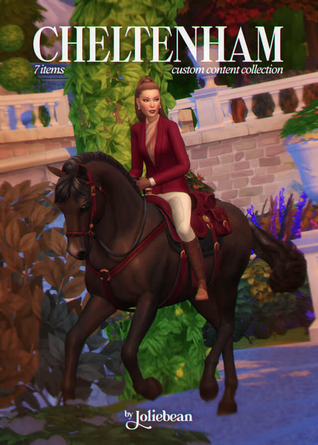 Cheltenham Set by Joliebean Immerse yourself in the world of refined equestrian fashion with the new exquisite collection, Cheltenham. Inspired by the timeless sophistication of English riding equipment, this clothing line seamlessly blends classic equestrian elements with contemporary style, catering to the modern sims who embrace both adventure and elegance. BGC standalones 7 items not allowed for random custom thumbnails