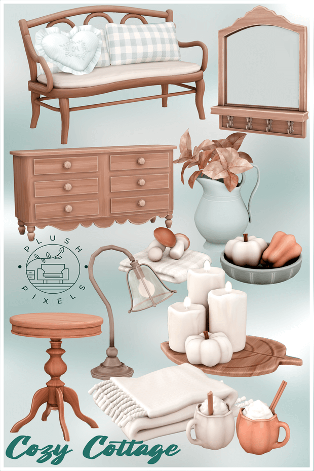 Cozy Cottage Can you smell the scent of pumpkin spice already? Fall has arrived and its time to take those blankets out the closet and cuddle up! This fall inspired set has 14 cozy pieces that come in various colors. Everything is base game compatible and can be found by its sets name in game. Hopefull you will enjoy this.