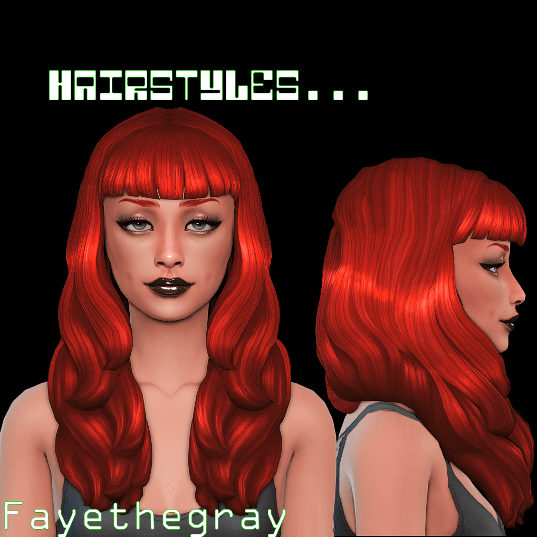 dawn’s hair by fayethegray Long, voluminous wavy hairstyle with full blunt bangs. Includes 24 EA swatches, 42 Aveira Kaleidoscope swatches, all LODs, all hat cuts, teen-elder, base game compatible.