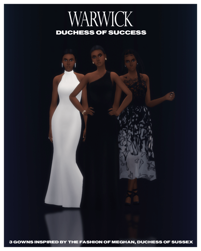 This August 4th (Meghan’s 42nd birthday) I decided to create some of my favourite outfits of hers during her time as a full-on member of the royal family. I’ve included three gowns from Meghan’s favourite fashion houses: Oscar de la Renta, Stella McCartney, and Clare Waight Keller for Givenchy (Keller also designed Meghan’s wedding gown). I hope you enjoy these sleek and elegant looks. Three evening gowns Teen to Elder Base game compatible All maps and LODS Custom thumbnails + disabled for random