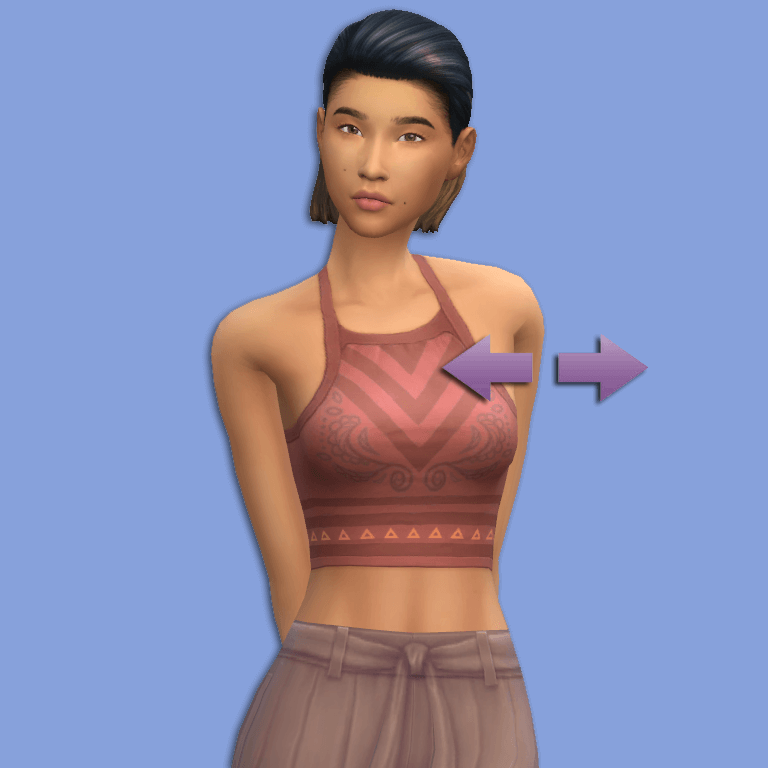 This slider adds the ability to control the width of female sims’ chests in CAS. It is something that has bugged me for a while as the chest and shoulder sliders didn’t quite make up for the lack of the ability to adjust the actual chest size. The width slider can be found when the sim’s back is facing the screen and the depth slider can be found when the sim is in profile. Both are left to right sliders.