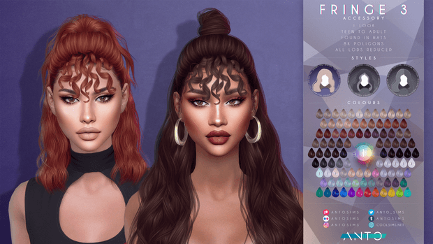 Fringe 3 (Requires The Chromatic Collection 1) Hello everyone! It’s been a century since I released a fringe, and I have a few in the queue to finish and upload, but I always end up prioritizing hairstyles 😂 Anyway, the wait is over hahaha. Here’s a curly fringe (or bangs for my friends across the pond hahaha) that I made for you all ❤️. It comes with 2 swatches. First one will grab the colour/texture from the hairstyle (Requires a Chromatic Collection 1 Hairstyle), so if you change the hair colour the fringe will match it as well. And there’s a second swatch that requires the Chromatic Collection 1 EXTRAS (like if it were a chunky/bicolour hairstyle), so you can either pick a different colour from the hairstyle or use it with another hair whether if it’s from The Chromatic Collection or not. Also, as requested by some people, now you can find it either in hats category or piercings, so you can use it with hats if you’d like to 😊. Hope you like it and wish you all a great weekend!