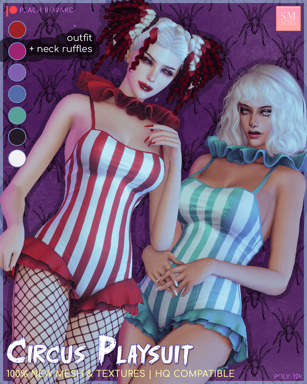 Halloween Circus Playsuit A bit of clowning around? Includes: outfit, neck ruffles (as necklace) Mesh: all LODs, 100% new, poly 12k Textures: 100% new, HQ enabled Model Credits: Skin & Makeup: NorthernSiberiaWinds, Sims3Melancholic, Obscurus Hair: Leahlilith, Reina