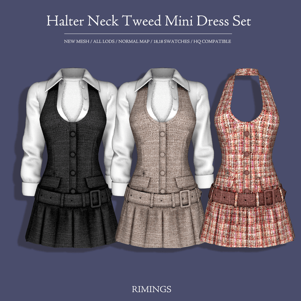 Halter Neck Tweed Mini Dress Set FULL BODY 2 – NEW MESH – ALL LODS – NORMAL MAP / SHADOW MAP – 18 / 18 SWATCHES – HQ COMPATIBLE