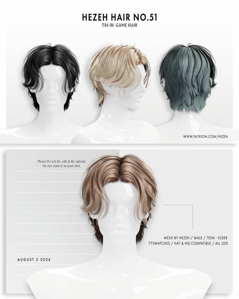 [Hezeh]Hair_No.51 MESH BY HEZEH UNISEX / TEEN – ELDER 77 SWATCHES / HQ & HAT COMPATIBLE / ALL LOD