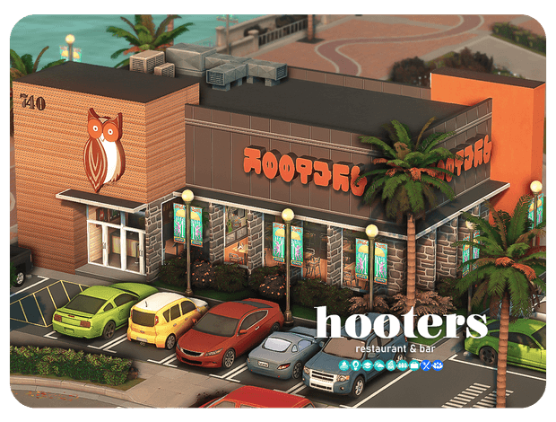 hooters: restaurant & bar 🦉 after ‘fixing’ my game aka rolling back to an older save file.. i’ve been working on restoring the lost progress on my builds; which sadly includes the target, a mall, a grocery store and several other restaurants. 🥲 today though, i’m happy to finally be able to complete and upload one those builds and i hope yall enjoy it as much as i do! 🦉🤍 important info: lot type: restaurant lot size: 30×20, placed in san sequoia (but i’m sure it looks fine in any world !) required EP’s: get to work, get together, city living, seasons, university life, eco lifestyle, highschool years, growing together required SP’s: dine out