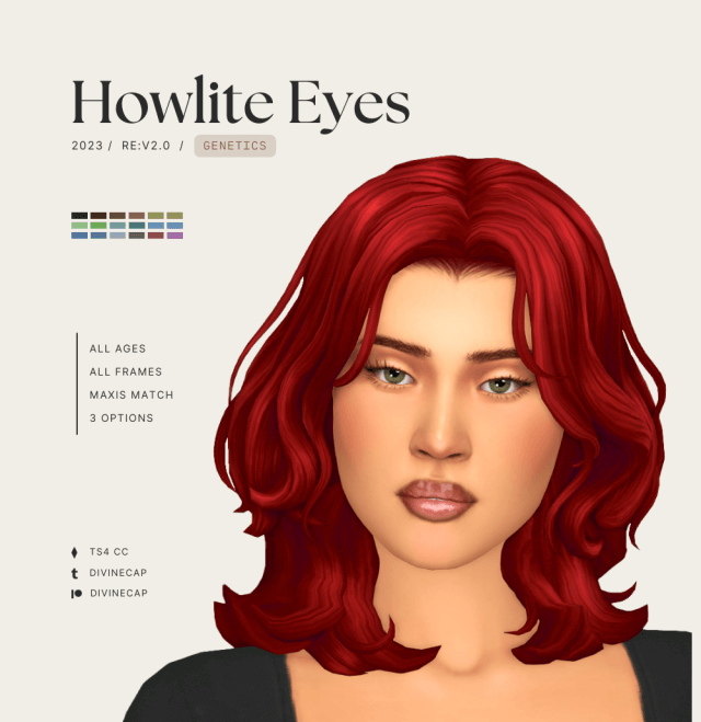 Howlite Eyes v2.0 𖥧 happy holidays… 🖤 originally released in 2021, now revamped! these eyes are maxis match with a bit of realism while still having a dreamy, cartoonish quality. BGC maxis match all ages & all frames 18 swatches (previews below the cut) custom thumbnails available options: default replacement nondefault add-ons contacts (category: face paint) heterochromia (category: skin details/left lip mole, conflicts