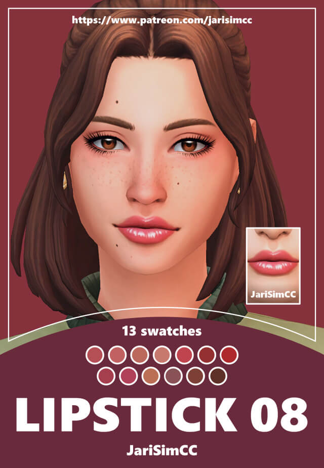 After millennia of being dead, I’ve returned with this gloss in intense and luminous shades. 13 swatches. Compatible with all makeup sliders. For female Sims. For teens and older. Custom thumbnail.