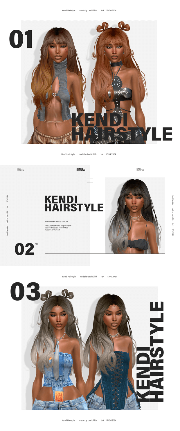 Kendi Hairstyle There are 4 versions of this hairstyle with or without little hearts and with or without the bangs. I also added 4 more swatches. Will be adding more with time. If you need any particular swatch please let me know <3