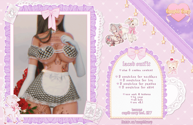 Laced Outfit 9 swatches for necklace 9 swatches for bra 9 swatches for panties & acc ver. 9 swatches for skirt & acc ver. [5k Poly] created using eve 9.1 new mesh & textures