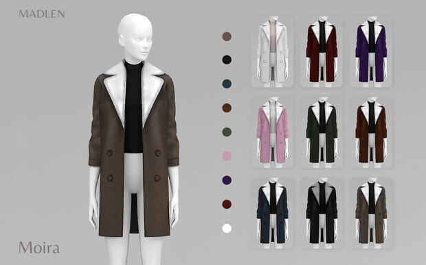 Madlen Moira Coat (with Fur) This is a fur version of previously released Moira coat. As you can see the fur is carefully added to match each colour. Most of it is combined with white fur but the black has a bit darker shade.