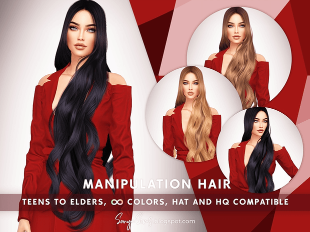 Manipulation Hair NOW PUBLIC – Very long hair for your sims with curls. Hope you like it! – All LODs (essential for gameplay performance). – Kids to elders. – HQ and hat compatible. – Almost unlimited colors. The Color Overlay file is not required. Download it only if you want to recolor this hair using sliders (additional mods are not required either). Learn how it works
