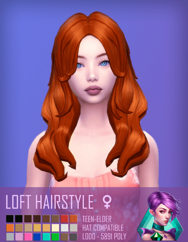 LOFT – Maxis Match Long Wavy Female Hairstyle My first Maxis Match Hairstyle for female sims 24 EA swatches All lods Hat compatible Smooth Weights LOD0 – 5891 poly Hope you will like it!