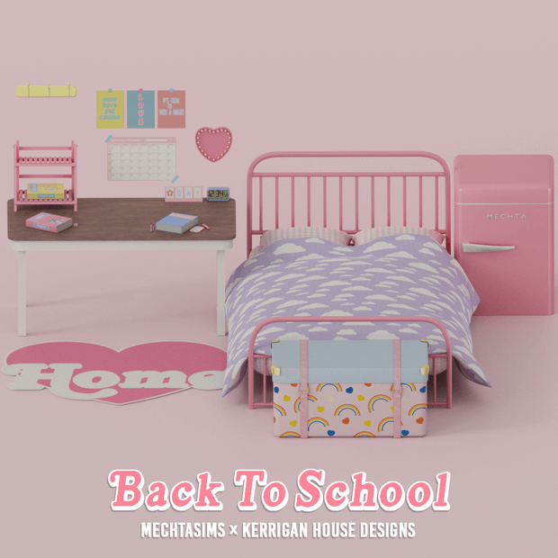 Mechtasims x Kerrigan House Designs: Back To School Hey loves! This month I bring you a fun collab I did with my friend, Kerrigan House Designs! A back to school set for your teens or dorm students, 18 new items for you to play with for my part, and 10 for her part. Go check hers out here! She is very talented and makes the loveliest creations. This set was so fun to make with her, so please show her some love too. 💖 I hope you enjoy and as always, let me know if you run into any issues. ^-^ Bed | 5 Swatches | 12K Polys | 8 Slots | *Semi-Functional Calendar | 5 Swatches | 40 Polys