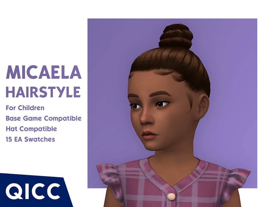 Micaela Hair A sleek high bun. – Maxis Match – Base game compatible – Hat compatible – Child – 15 EA swatches