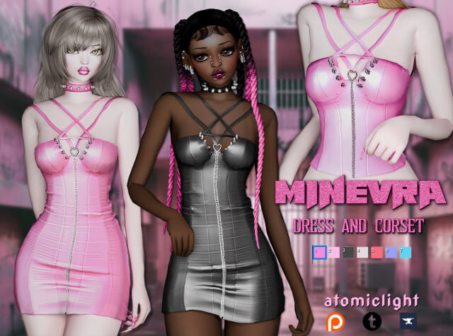 Minevra mini dress and corset zip-up bodycon mini dress and corset with spikes 7 swatches BGC, HQC, all LODs, teen-elder, full texture sets, custom thumbs