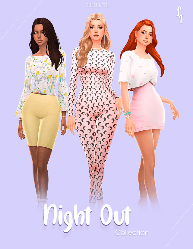 NIGHT OUT Base game compatible Base game compatible 11 items Woman, full body, top and bottom 30 Swatches (full colors and patterns) All LOD’s and Maps
