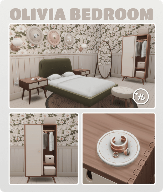 OLIVIA BEDROOM Hello everyone! I’m excited to announce that Olivia’s bedroom, the second part of this set, is finally finished and ready to share with you! 😄 This set includes 13 new meshes: Retro bedframe Bedding Bedside table Decorative item: plate with jewelry Wardrobe (requires the HORSE RANCH EXPANSION PACK) Standing mirror Rug Wall light