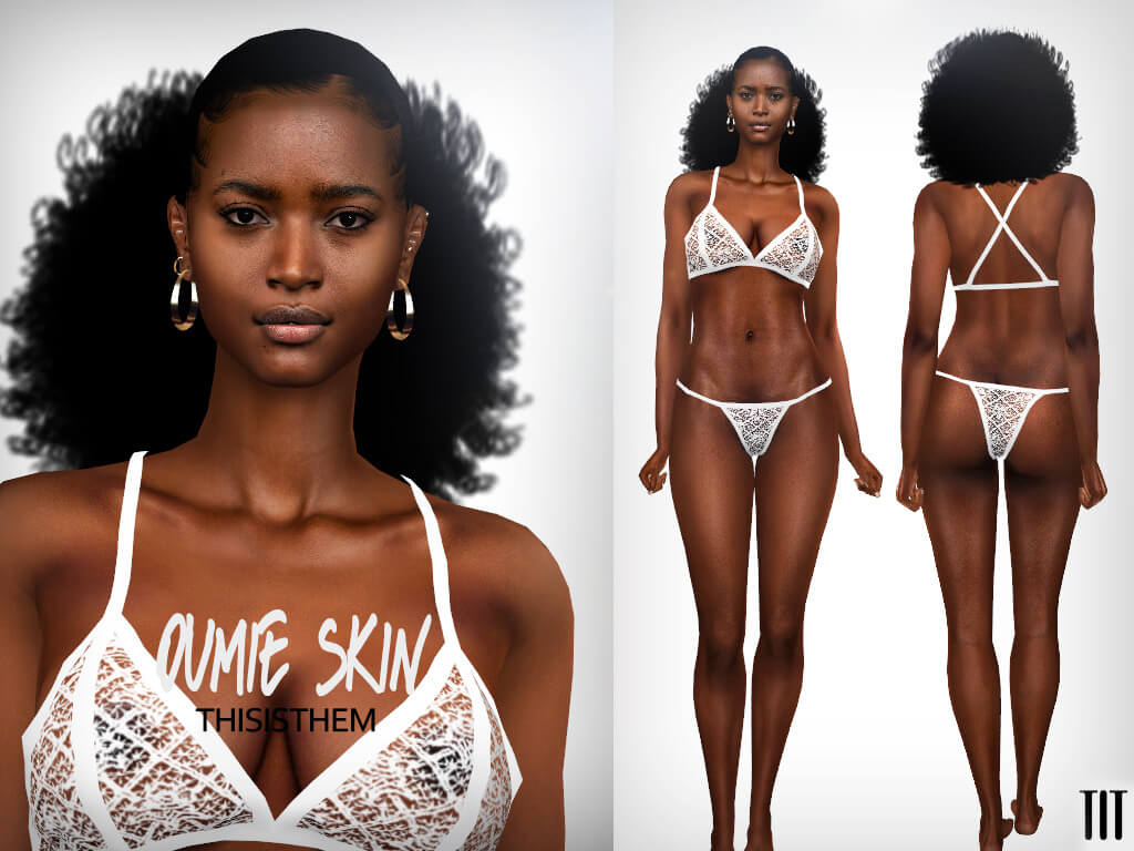 Oumie’s Skin HQ Textures / HQ Compatible ; 2 versions (14 swatches for each) ; Without eyebrows ; Overlay : 2 versions (5 swatches for each) ; Teen to Elder ; Skin Details Category ; Custom Thumbnails ; Don’t re-upload or claim as your own. Photos taken with HQ Mod. Sliders used.