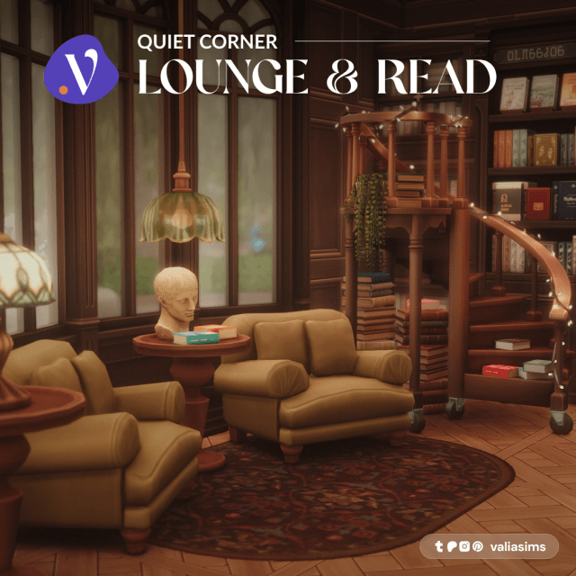 Quiet Corner – Lounge & Read Hey everyone! The last part of the Quiet Corner Collection is here! The main theme for this part is the lounge area where you can sit down and read your favorite book. I know bookshops usually don’t have this area but this is a fancy bookshop