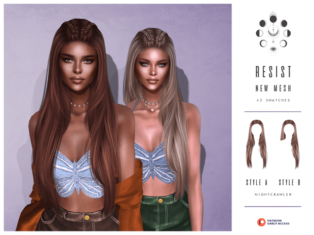 RESIST HAIR NEW HAIR MESH T/E 2 Style options Smooth bone assignment All lods 42 colors Ambient occlusion Works with hats Comes with custom thumbnail Transparency issues- very little