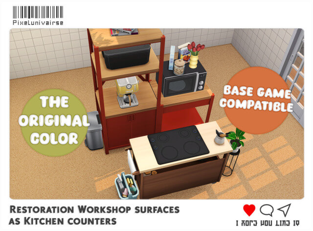 Restoration Workshop surfaces as KitchenPS: They are just as you can see in the pic they don’t have all the counters shapes I just made them so I can place kitchen appliances on them👍.