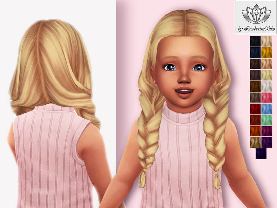 Sierra Hair – Style 1 (Toddler version) An effortless double braid hairstyle. Maxis Match EA Swatches + 6 custom swatches Toddler age group Disabled for random Custom thumbnails Female tags Base Game Compatible Hat compatible