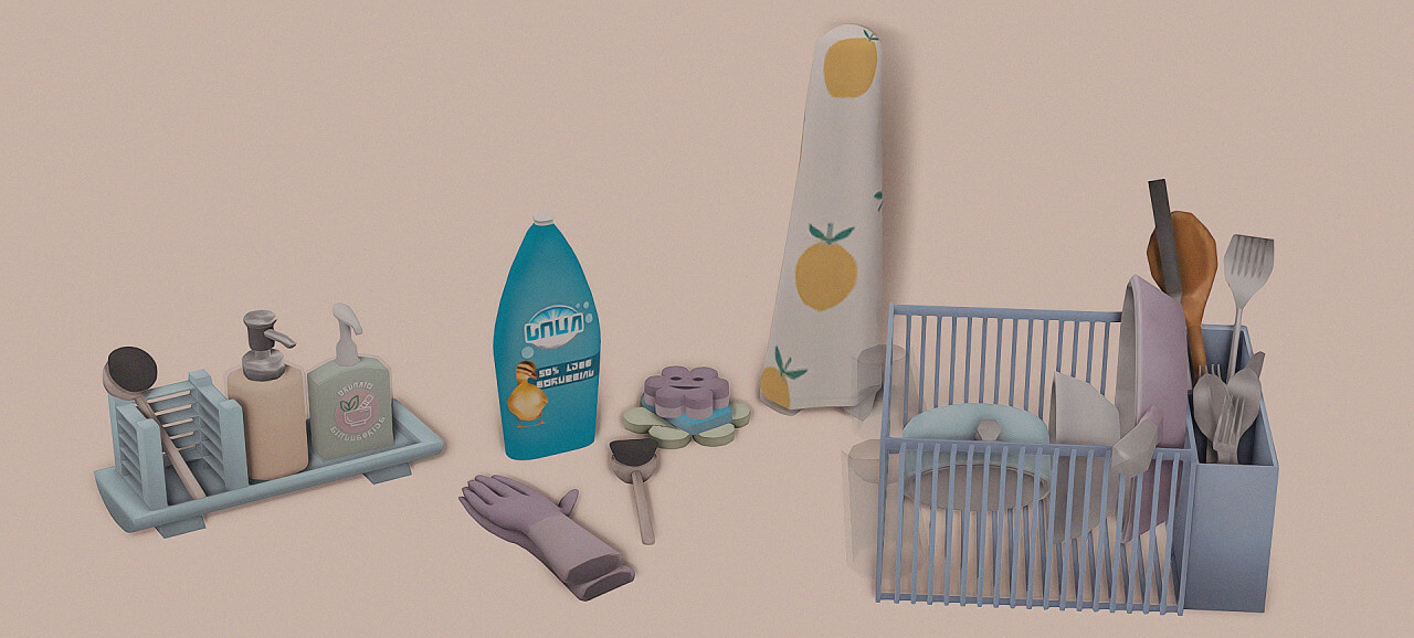Loved this set by aroundthesims and it was a huge inspiration for this set! I’m extra and wanted a bunch of options for the dish rack including pots, pans, bowls and utensils. Made some other goodies too! This set took me what feels like my whole life but I had a lot of fun making it and I hope you guys love it!