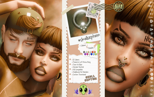 Skull Septum Piercing Pretty proud of this. I hope you enjoy it! x12 Colours Found in Left Brow Ring New Mesh All LODs Gender Neutral Teen – Elder HQ Compatible Disallowed for Random Custom Thumbnail Base Game Only
