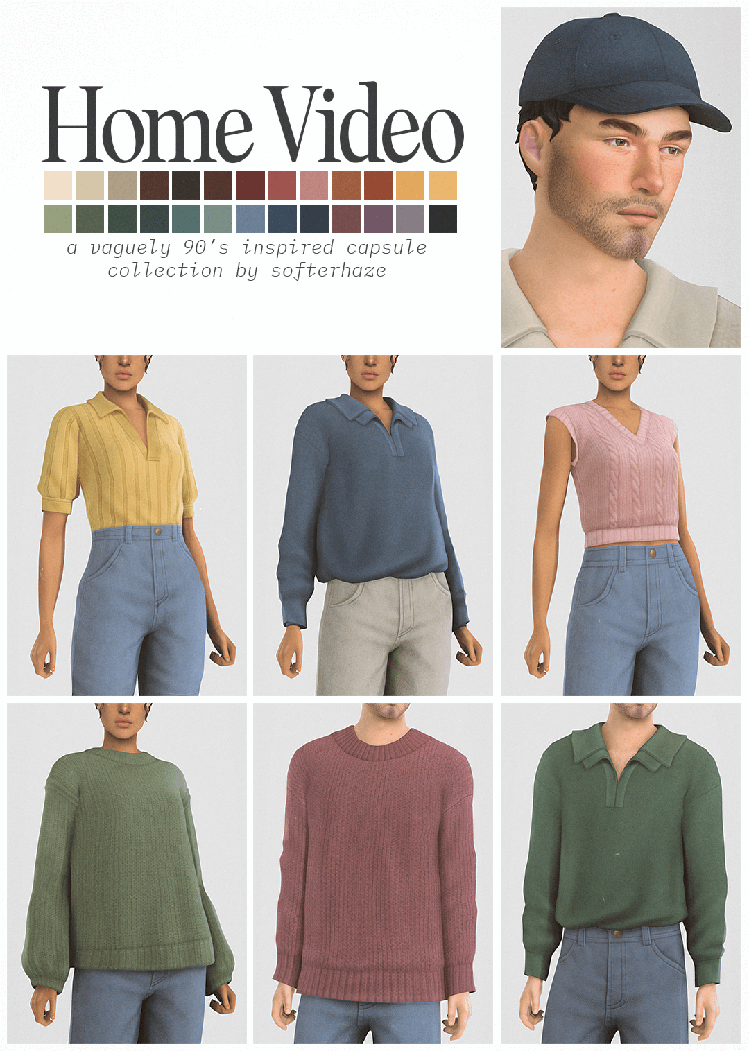 home video; just a small set of recolors and mini mesh edits that i threw together for my sunday save 📹 ∴ base game compatible, 8 items in 26 swatches that i’ve been using for my personal recolors lately! 7 items are shown, but i’ve also included the child version of the oversized polo, i was just too lazy to re-download child cas poses