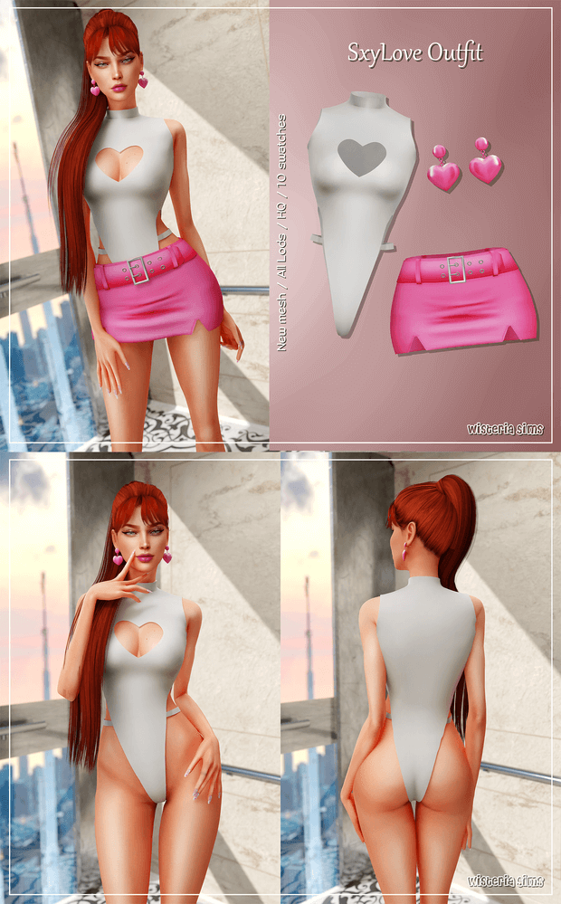 SxyLove Outfit se’t FREE FOR ALL – FOR WOMAN – NEW MESH – TEEN TO ELDER – BodySuit: ClothingTop Category* 15799k PolyCount – Skirt: ClothingBottom Category* 16991k PolyCount – Earrings: Earrings Category* 1200k PolyCount – 10 swatches – Base Game Compatible – HQ Mod Compatible – All Lod’s – Specular & Normal Map – Custom Thumbnail