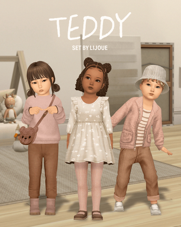 teddy set — full download Base game compatible Please don’t re-upload or claim as your own. Please include the mesh if you recolour, but your post should include a working link to my page as credit. The baby hair skin detail (found in brows) can be worn by all ages The bear bag can be found in bracelets. There may be some clipping issues