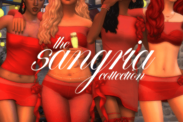 The Sangria Collection | greenllamas The Sangria Collection consists of 7 new items to dress your sims up in for a perfect dinner at dusk, ready to enjoy the last of the summer with a pitcher of red sangria. This collection includes: 2 Hairs 2 Tops 2 Bottoms 1 Fullbody Shoes featured are by @sentate. The boots are from the downtown collection.