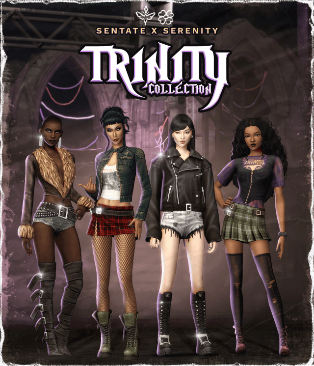 The Trinity Collection – By Sentate & Serenity For this years collection Serenity had the idea to create a set of looks inspired by our very own punk band; Featuring a mix of stage worthy statement pieces and versatile destroyed denim items, The Trinity Collection is here to make sure your sims style shouts a little louder than the rest.