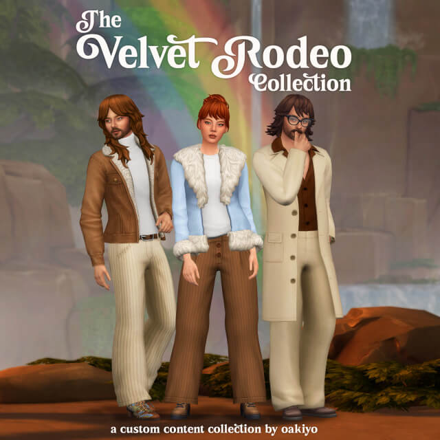 The Velvet Rodeo Collection:This month is a special month – I made male CC! The collection takes inspiration from 60’s/70’s fashion, loosely based off Western desert and urban city aesthetics. This collection contains 7 items, compatible for both male and female frames! Base game compatible Hairs come in 24 EA swatches Hairs are hat compatible Clothes come in 18 swatches All maps and LOD’s Custom CAS thumbnails Disabled for random sims